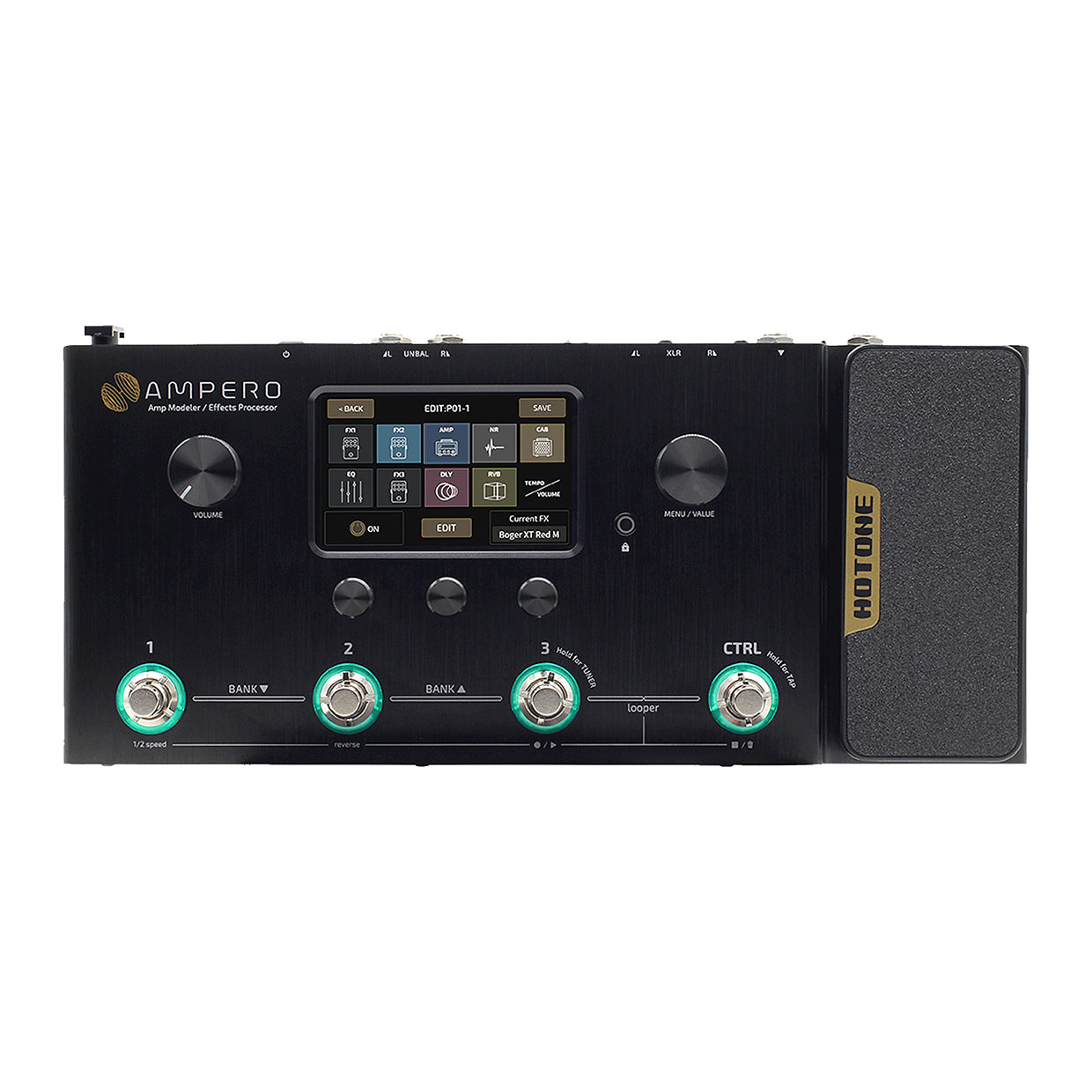 ・244 effects、HOTONE独自のモデリングメソードCDCM HD & F.I.R.E.による完成度が高い64 x Amp、60 x CAB、100 x ご存知のペダル。