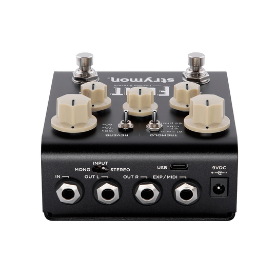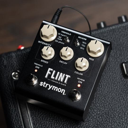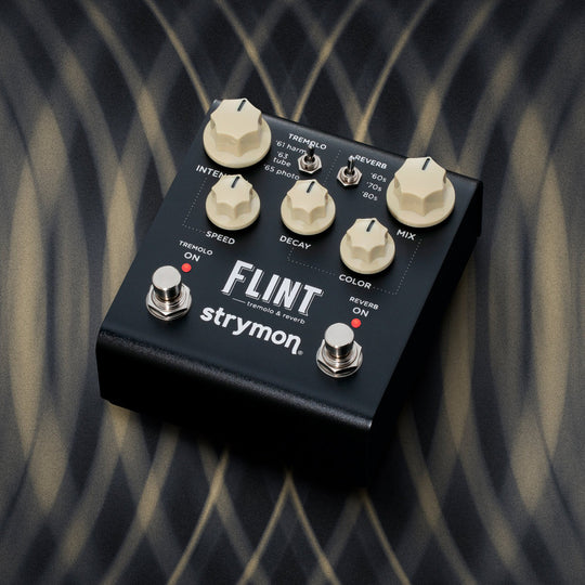 THE NEXT GENERATION. FLINT V2 ビンテージアンプに搭載されていたトレモロ回路の揺らめきや上質で幻想的なトレモロエフェクトと、3つの異なるリバーブのアルゴリズムを備えています。トレモロ側では、複雑な効果を生み出す'61ハーモニックトレモロ、泥臭い色気のある'63パワーチューブトレモロ、シャープでバランスの取れた'65フォトセルトレモロへ切り替えられます。リバーブ側では、クラシックな60年代のスプリングリバーブ、独創的な70年代のエレクトロニックプレートリバーブ、ノスタルジックな80年代のラックリバーブ(ホールタイプ)の3種類から選べます。9つのパラメーターを微調整することで、トレモロ、リバーブキャラクターの細部までコントロールできます。水しぶきのようなきらめき、パルスのような響き、鼓動するブルージィサウンド、アンビエントな揺らぎ、穏やかなリバーブパッドなど、そのサウンドメイクは実に多彩です。各エフェクトセクションにそれぞれトゥルーバイパスのオンオフスイッチを搭載し、入出力部にはクオリティーの高いアナログセクションを採用しました。Flintは音楽の歴史に刻まれたトレモロとリバーブサウンドを、ペダルフォーマットで届けてくれます。 特徴 ハイインピーダンス超低ノイズClassA JFETプリアンプ入力 ローインピーダンス・ステレオ出力 TRSエクスプレッションペダル、Strymon MINI Switch、MULTI Switch PLUS、TRS MIDIが接続可能なエクスプレッション入力 コンピューターとのMIDIコネクション、ファームウエアのアップデートが可能なUSB-Cジャック搭載 独立のリバーブとトレモロオン/オフスイッチ 300のプリセット保存とMIDIフル対応 超低ノイズ、ハイパフォーマンスの24-bit 96kHz、A/D&D/Aコンバータがもたらす妥協のないオーディオクオリティ ハイパフォーマンス 520MHz ARM スーパースカラープロセッサー 32-bit浮遊演算プロセッシング 20Hzから20kHzのフリーケンシーレスポンス 9VDC(センターマイナス)300mA 本物を超えた本物 ギターエフェクトの創成期に登場したトレモロ、そしてリバーブ。この2つの魅惑的な組み合わせは理想的なコンビネーションでした。1960年代の定番アンプに搭載されたこれらのエフェクトは、初期のサーフミュージック、泥臭いアメリカ南部のブルース、マカロニウエスタン、フィルムノワールのサウンドトラックから現代のインディーズロックまで、数え切れないほどのレコードやパフォーマンスに彩りを添えました。音楽の進化とともに、アーティストに尽きることのないインスピレーションを与え続けてきたのです。この組み合わせを再現するスタジオクラスの高品位ペダルです。人気があり定番のトレモロ回路とリバーブ回路を徹底的に調べ尽くし、複雑な音のレイヤーや細かなニュアンスまで、独自のアルゴリズムによって忠実に再現することに成功しました。一方にトレモロ、もう片方にリバーブを搭載した、1台で2台分のエフェクターなのです。 サウンドはビンテージ、機能は最新 最先端の技術と新たなハードウェアとデザインにより、オリジナルと同様にゴージャスなトレモロとリバーブサウンドを提供いたします。さらに、全てにおける改良は、ステージやスタジオの柔軟で、パワフルなツールとしての活躍をお約束します。 拡張されたコントロールスローなトレモロはいかがですか?SpeedノブのLFOスピードを1Hz近くまでレンジを広げました。リバーブ側ではプリディレイタイムも調整できるように変更しました。 研ぎ澄まされたハードウェアプレミアムなアナログJFET入力回路は、演奏に対して素晴らしい応答性を誇ります。リアパネルにあるスイッチで、モノラルまたはステレオ入力切り替えが可能です。さらに、新しいARM DSPチップはペダルボードのエネルギー消費を抑えながら、あらゆる音の細かなニュアンスをつぶさに捉える高い処理能力を提供します。 MIDIにフル対応ほぼすべてのノブ、スイッチ、設定をEXP/MIDIジャックまたはUSBを介してリモートコントロールできます。また、作成したすべての新しいサウンドを300プリセットとして保存でき、いつでも呼び出すことができます。...通常価格 ¥58,000通常価格 ¥58,000 -