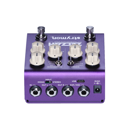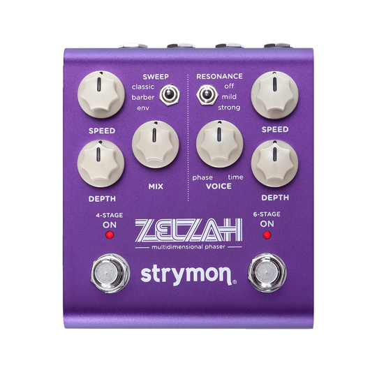 甦る記憶とともに ひとたびZELZAHのフットスイッチを踏んであのコードを鳴らせば、溢れるヴァイヴとイカしたボイシングのクラシカルなフェイザートーンが甦ります。ZELZAHはビブラート、ゴージャスなフランジャーとコーラス、そして、これまでに聴いたことのない新たな音へ、シームレスに導く――多彩なコントロールを備えたビンテージライクな4ステージ&6ステージのフェイザーです。搭載されたすべてのノブを駆使し、この上なく音楽的なトーンを響かせてください。ZELZAHには2つの異なるフェイザーが搭載されています。4ステージフェイザーは、フェイザーからビブラートまで幅広いクラシックなトーンをもたらし、6ステージフェイザーは、フェイザー、フランジャー、コーラス、それらのミクスチャーとも呼べるサウンドまで届けてくれます。一方にコーラス、他方に舞い上がるバーバー極性のフェイザー。また、片側にフェイザー、もう一方にトレモロをセットすることも可能です。それぞれを独立させたり、または同じエフェクトをセットしたり、様々なスタイルでのプレイに対応してくれます。ZELZAHがボードから離せないモジュレーションペダルになることは間違いありません。 特徴 Classic、Barber、Envelope、3つの異なるスイープモードを備えた4ステージフェーザー 6ステージフェーザーのアルゴリズムにフェーズ〜フランジャー〜コーラスへのエフェクトレンジ(VOICEコントロール)、さらに全設定に効くレゾナンス切り替えスイッチを追加 各セクションは個々にまたは一緒に使用可能。同時に使用する際は、それらをシリーズ、パラレル、スプリット3つの異なる接続方式でプレイ インストルメントとライン信号の入力信号レベルが切り替え可能 トゥルーバイパスとバッファードバイパスが選択可能 EXP/MIDIジャックは、TRSエクスプレッションペダル、Mini Switch、MULTI Switch PLUS、TRS MIDIの接続可能 MIDI機能をフルサポート300プリセット&リアルタイムパラメーターコントロール(1/4フォーンTRS、strymon MIDI EXPケーブル、MIDI→TRSインターフェース)が可能 USBジャックはPCからのMIDI機能とファームウェアアップデートをサポート 高品位JFET アナログ入力段デザイン 超低ノイズ設計、最高品位24-bit 96kHz A/D&D/Aコンバージョン ハイインピーダンス、超ローノイズ、ディスクリートClass A JFETプリアンプ搭載 32bit浮遊演算プロセッシング ローインピーダンス ステレオ出力 スウィープスタイルを貴方が選べます クラシックスイープ1番目のスイープモードは、「Classic」と記された4ステージのクラシックなフェーズスタイルです。上昇下降を繰り返すトライアングルシェープのLFOが、記憶の中に残るビンテージサウンドを届けてくれます。 バーバースイープ理髪店のバーバーポールをイメージしたような、継続的に上昇または下降スイープする周波数シフターです。4ステージサウンドを保ちながら、全ステージを同期させてこのサウンドを作り上げました。 エンベロープフェーザーSPEEDとDEPTHの設定レンジに従って、タッチセンシティブなエンベロープフェーズエフェクトが得られます。ピッキングの強弱に合わせて、エンベロープフィルター/オートワウのような効果が得られ、複雑なハーモニクスとファンキーなサウンドを演出してくれます。 6ステージのボイス:画期的な新フェイザーアルゴリズムを採用 30種を超えるパラメーターを同時にコントロールし、感激的なミュージカルエクスペリエンスへと導いてくれます。厚く豊かなピュアビンテージバイブが得られるだけでなく、VOICEノブを回せば、タイムレスポンスが加えられ、典型的なオールパスフィルター(フェーズ回路)からシームレスにスペース感をサウンドに追加します。これによって、単なるフェイザーとフランジャーがミックスされた音などではなく、新鮮で音楽的な幅広いNewトーンを究めることができます。VOICEノブを右に回すとリッチなフランジャー効果が得られ、豊かなビンテージコーラスサウンドが深淵まで響きます。このノブの操作により、豊富なミュージカルなアイデアが湧き、音作りに様々なスパイスを加えてくれます。 サウンドデザイン インスピレーション:ビンテージフェイザー開発にあたっての我々のゴールは、エレキギターとエレクトリックピアノで美しく響く1970年代の豊かなフェイザーサウンド。それが求めた音でした。さらに、慣れ親しんだビンテージフェイザーの中でも最も優れた音をお届けするだけでなく、音の可能性を広げ、ユニークでフェイザーを超えた斬新なサウンドも実現したかったのです。そのために6ステージフェイザーのベースとしてモディファイされた、オールパスフィルターを含む新たなアーキテクチャを開発しました。フェイザーはカスケードオールパスフィルターで構成され、フェージング効果を生み出します。そこにはディレイラインはありません。我々が改良したオールパス構造には、オールパスにタイムストレッチを加
