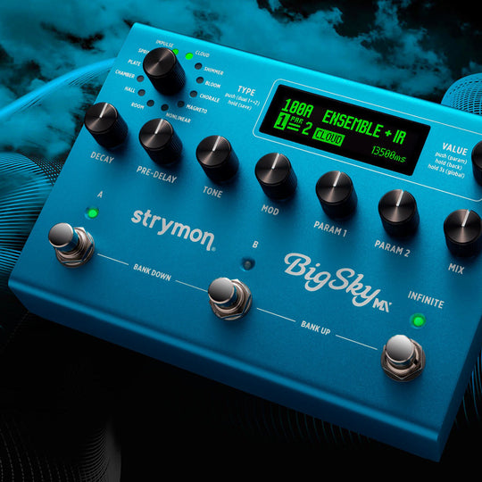 目の前に広がるクリアースカイ 楽器をBigSkyに接続したその瞬間、貴方のサウンドは遥か高く成層圏まで導かれるでしょう。眼下に広がる景色はどんどん遠ざかり、青く輝くリバーブの光の中へと誘われます。自然で美しく包み込むようなリバーブを生み出す為に、BigSkyのプロジェクトには膨大な量のエンジニアリングとアーティスティックなイマジネーションが必要でした。まず、我々は音響学の基礎をガイドに、過去50年で研究されてきたリバーブ技術を学び、それらを改めて科学的に分析しました。その結果、我々はクラシックなリバーブサウンドの本質を捉え、そこから未来のリバーブのビジョンを構築してゆきました。 特徴 ・スタジオ機材級のアルゴリズムによる、高品位のリバーブエフェクト・12種類のリバーブアルゴリズムを搭載・超高音質設計:109dB(100% Wet時)/ 115dB(50% Dry時)のダイナミックレンジを実現・ドライ信号は完全なアナログパスを採用・ギタースピーカーを克明にエミュレートしたキャビネットエミュレーター搭載・+/- 3dB ブースト/カットがプリセット毎に設定&登録可能・パラレル接続時に便利なキルドライモード・最大300プリセットが保存可能 新たなリバーブの領域へ 12種類のスタジオレベルのリバーブが用意されています。新しいリバーブは、全く別次元のレベルに到達させることを目標に開発を開始しました。細部まで拘り抜いたディテール、革新的なアナログ回路のデザイン、強力なSHARCプロセッサー、そして最高級のパーツを使用して、ラックマウント機器を凌ぐオーディオクオリティーをペダルボードの大きさに収めることに成功しました。科学とアートの融合が、ついにゴールを迎えたのです。BigSkyは貴方に音楽的なインスピレーションをお届けします。 【スプリングリバーブ】このバネのテンションを感じてください。【クラウド】この浮遊する粒子を感じてください。【ノンリニア】物理法則を「ノンリニア」で飛び越えてください。【マグニート】封印されていたマルチヘッドリバーブを世に解き放ってください。 超高音質設計 透明感――それがBigSkyのアナログ回路設計のベースです。エフェクト音のみがアルゴリズムにより色付けされ、アナログ信号へは何も手が加えられません。strymonのトゥルーバイパス回路はメカニカルリレーが使用され、入力信号をダイレクトに出力に送り出す様に切り換えます。バッファードバイパス回路は1MegΩの入力インピーダンスにマッチングして、ギターのピックアップからの音をそのままBigSkyへ入力します。出力インピーダンスは100Ωで、非常に長いケーブルを引き回しても音色の変化はありません。また、本機はギターピックアップのサーマルノイズ程度の極低ノイズ設計です。ディテールに拘り、最高級パーツとスタジオ機材と同等の24-bit 96kHzA/D - D/Aコンバーターを採用し、100%ウェット時でもラック機器を凌ぐ109dBのダイナミックレンジを実現しました。ドライ信号とウェット信号が1:1のミックス時には、115dBを誇ります。これらの数字がどれだけ素晴らしい数値であるかは、ご理解頂けると思います。 シンプルでパワフルなコントロール あなたのイマジネーションの邪魔にならない操作性を目指し、ヒューマンインターフェースの設計に膨大な時間を費やしました。まず、不可欠なリバーブコントロールを選び出し、その上で、複雑で面倒な操作を行わずにイメージしたサウンドが簡単に得られるように、各コントロールのレンジや機能性を追求しました。 キャビネットフィルター ライン録音やフルレンジPAシステムへの直結、ヘッドフォンの使用などのギターアンプを使用しない状況があります。通常、リバーブはエフェクトのチェーンの中で最後尾に接続される事が多い事に着目し、キャビネットのエミュレーションを組み込むことを決めました。背面パネルにあるCab Filterをオンにすると、ギタースピーカーを克明にエミュレートした周波数特性が得られます。ODやディストーションペダルのサウンドは、アンプで鳴らした様なサウンドになり、クリーンサウンドは存在感を残しつつエッジが取れたサウンドに生まれ変わります。 アナログドライ信号パス 一般的なデジタルリバーブでは、ドライ信号は一度デジタルに変換されるため、変換時のノイズやレイテンシーが発生してしまいます。更に悪い事に、デジタルのドライ信号とウェット信号のミックス前に信号レベルを下げる「アッテネーション」が行われる場合があります。その後、信号レベルを上げるため変換ノイズまで一緒に増幅してしまいます。このような音質へ悪影響を与える恐ろしい事態を避けるため、BigSkyのドライ信号は完全なアナログパスを採用しています。我々が知る限り、プログラム可能なMixコントロールを搭載し、アナログドライ信号パス方式を採用しているのはstrymonだけです。ドライ信号がデジタルに変換されないだけでなく、プリセットごとにMixレベルが設定でき