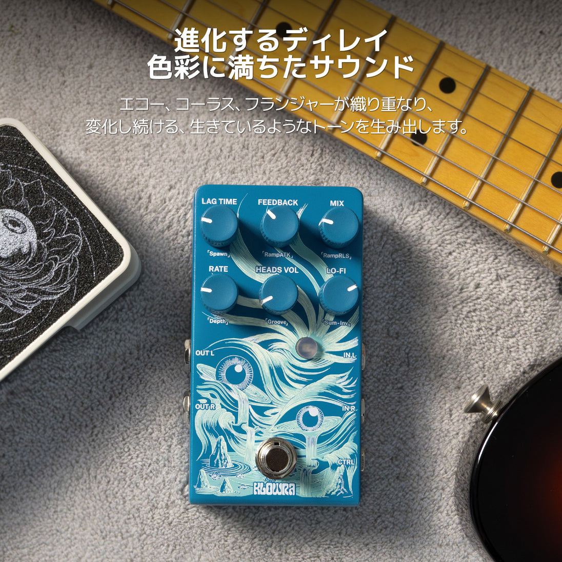KLOWRA Rilumは、クラシックなマルチトラックテープエコーに着想を得たマルチヘッドディレイ&モジュレーションペダルです。